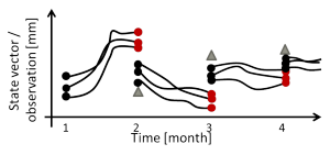 Within GlobalCDA, sequential DA methods will be implemented as often used for catchment-scale hydrological studies. However, we will, for the first time, develop a C/DA framework at global scale. Sequential methods predict model states to the actual observation epochs, and consider the data as soon as they are available, different from variational data assimilation. The result is used as the initial state for the next model prediction.