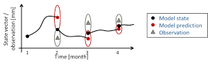 Figure 2 illustrates how DA works in two steps. First, model states are simulated or predicted (by running the model code). Second, the prediction is compared to the observations. Depending on the assumed uncertainties of model prediction and observation, an updated optimal state estimate is calculated. It is also possible to combine the DA with the estimation (calibration) of model parameters in a combined Calibration and Data Assimilation (C/DA) framework.